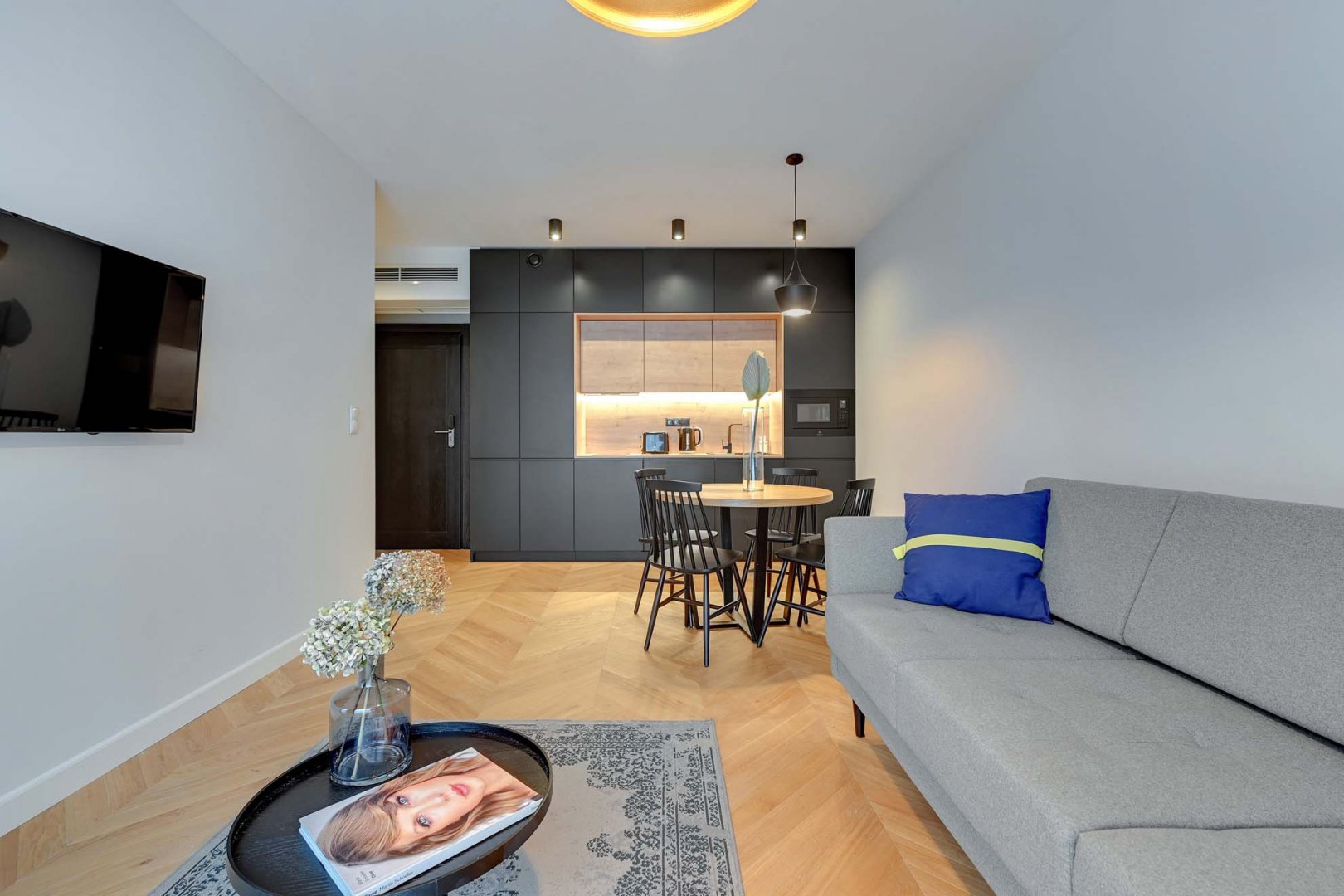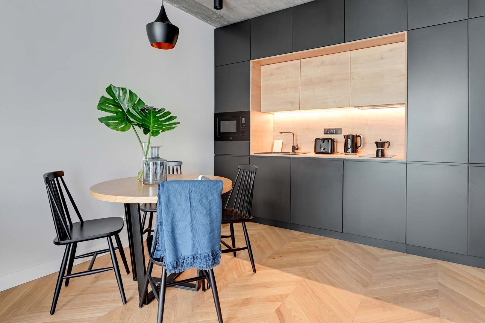 W apartamencie znajduje się wyposażony w lodówkę, zmywarkę, płytę grzewczą, mikrofalówkę, czajnik elektryczny i toster oraz przybory kuchenne aneks kuchenny.
