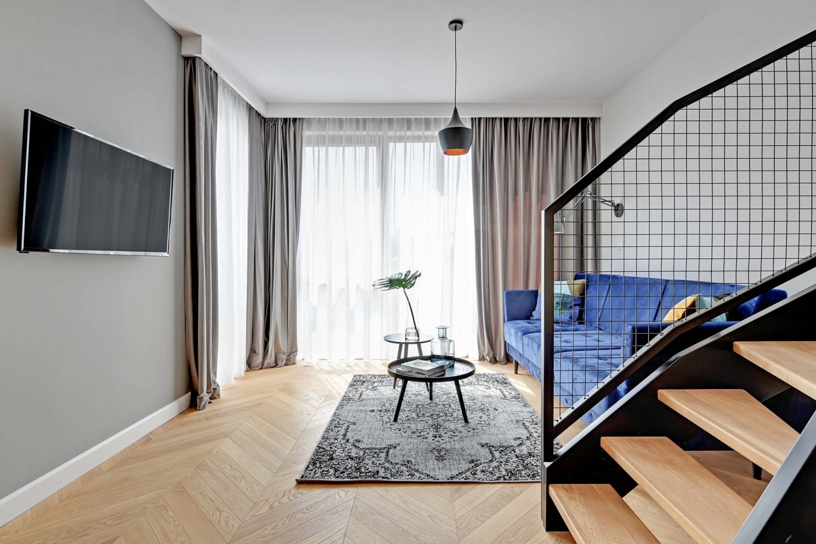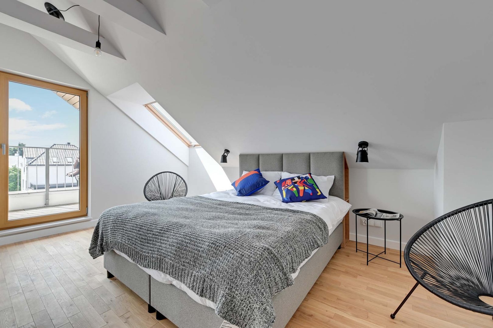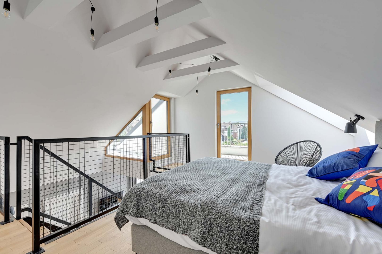 - sypialnia na dolnej kondygnacji apartamentu z wyjściem na balkon