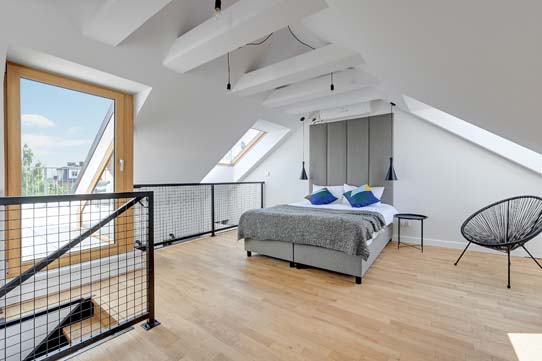 - sypialnia na antresoli z wyjściem na balkon i taras