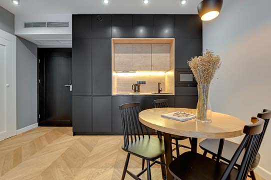 W apartamencie znajduje się wyposażony w lodówkę, zmywarkę, płytę grzewczą, mikrofalówkę, czajnik elektryczny i toster oraz przybory kuchenne aneks kuchenny.